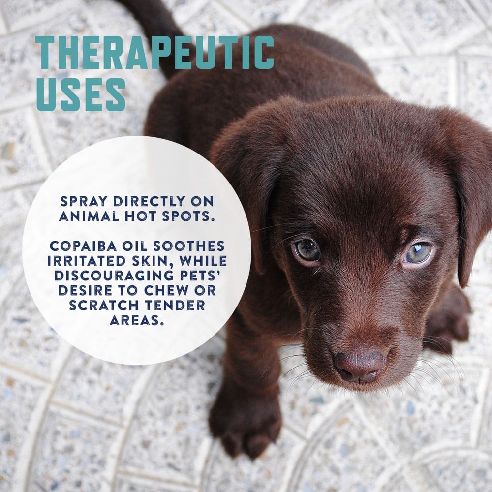 Spraying on rough, tender skin? Stop the aggravating behavior—AND help soothe and heal hot spots thanks to the Copaiba essential oil.
