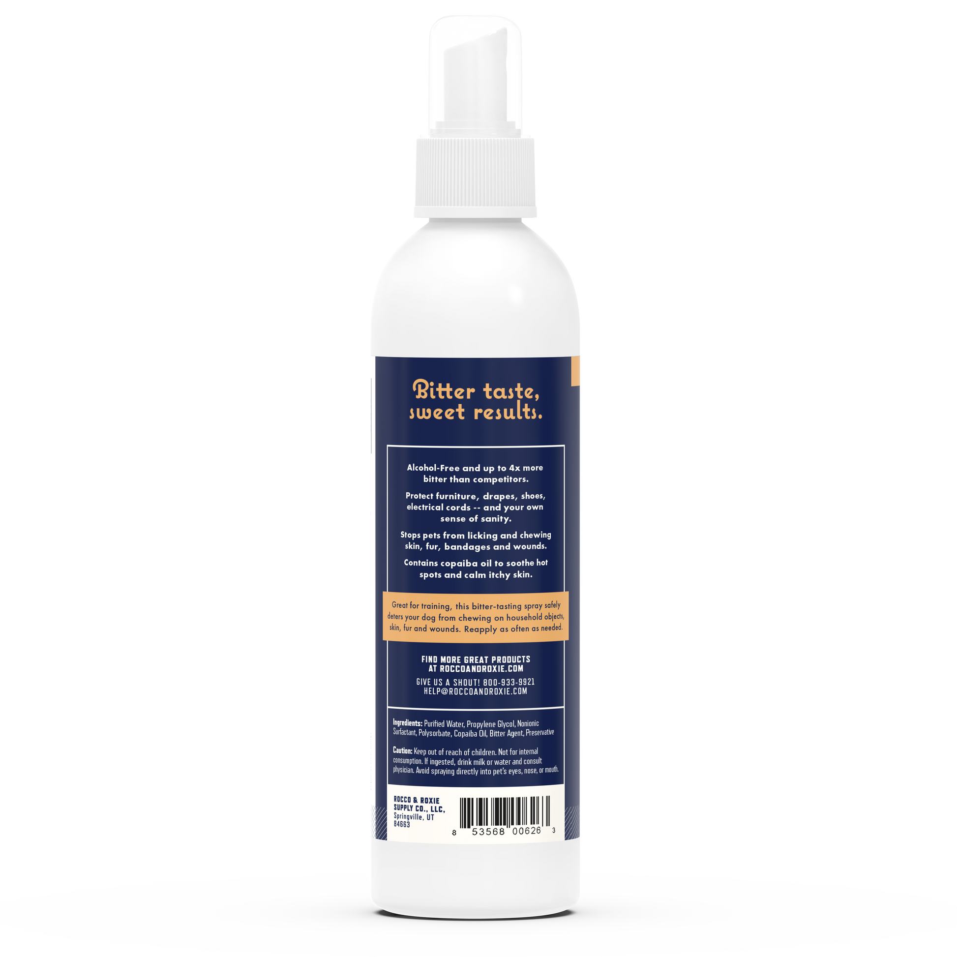 In addition, it contains calming Copaiba oil, an essential oil known for its abilities to soothe inflamed skin and hot spots. So not only does our spray deter pets from gnawing away on fur, bandages, and wounds, it helps in the healing process. Of course, like all Rocco & Roxie products, you won’t find “baddies” like harmful alcohol or stinging chemicals in this formula. You can spray No Chew right on pets’ skin—or over the topical medicines, you’ve applied. It keeps on working even as it dries, unlike alcohol-based products whose power diminishes as the alcohol evaporates. Go ahead and use it as often as necessary, though it shouldn’t take long for him to get the message!
